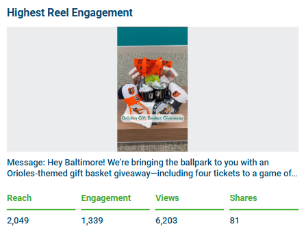 After 3 months of content planning, getting some profile updates and having some consistent posting, there was a social media launch strategy to acquire new followers. Alongside the partnership with Baltimore Orioles and putting together a gift basket giveaway, the goal was to attract local sports fans—a demographically diverse audience that aligned with Tower's community focus. This strategic contest generated over 6,000 views and 1,300 interactions, with more than half the views coming from non-followers. This content boosted the initiative and attracted 1,133 new followers and achieved a remarkable 96% retention rate.